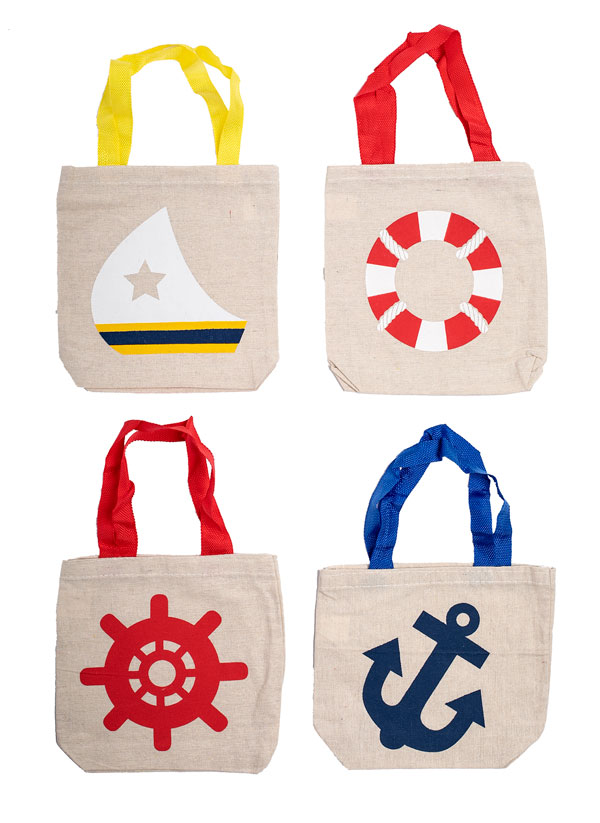 Set sail with these bags! They're perfect for stashing a few beach supplies for a day of sun and fun, or use them as treat bags for prizes. Each tote bag has a nautical accent and handles. Canvas. Bags: 8" x 8½". Handles: 5½".