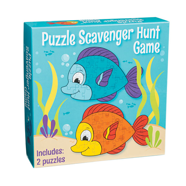 Combines a jigsaw puzzle with a scavenger hunt. 2 cardboard puzzles (33 pieces each). Each puzzle is 28" x 18".