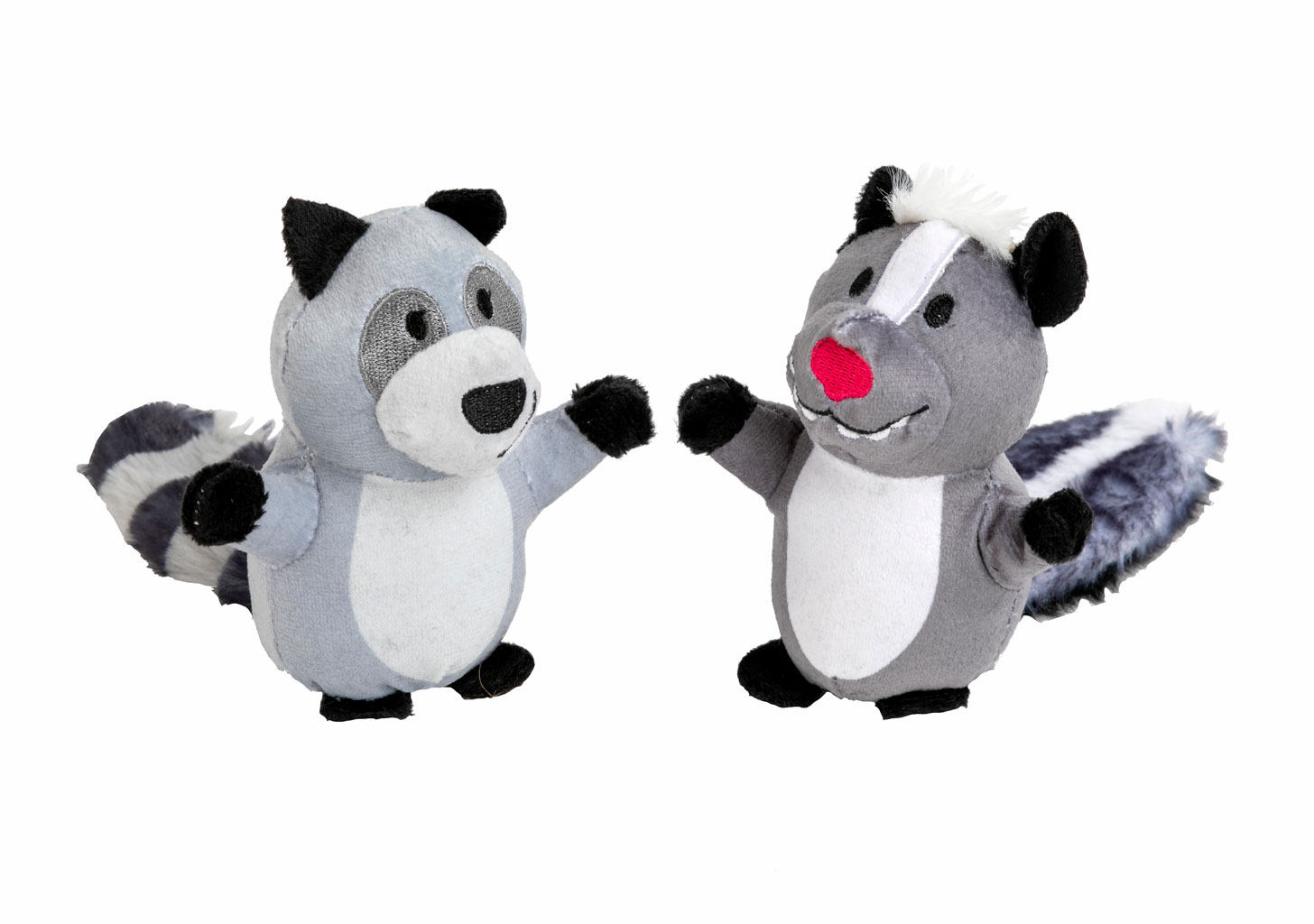 Plush raccoon and skunk. 3½" x 2¼" x 6¾".