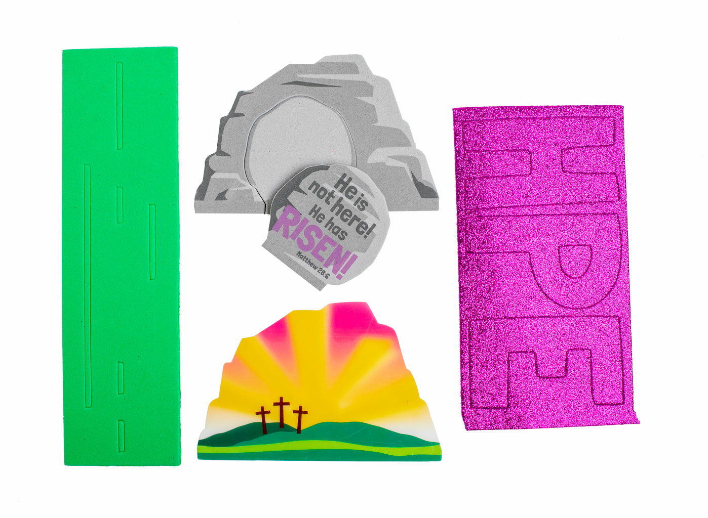 Place this craft in front of a light or window to illuminate the scene through the empty tomb. Foam pieces with plastic tomb-opening scene. Outlet item. 8½" x 2¼" x 6½".